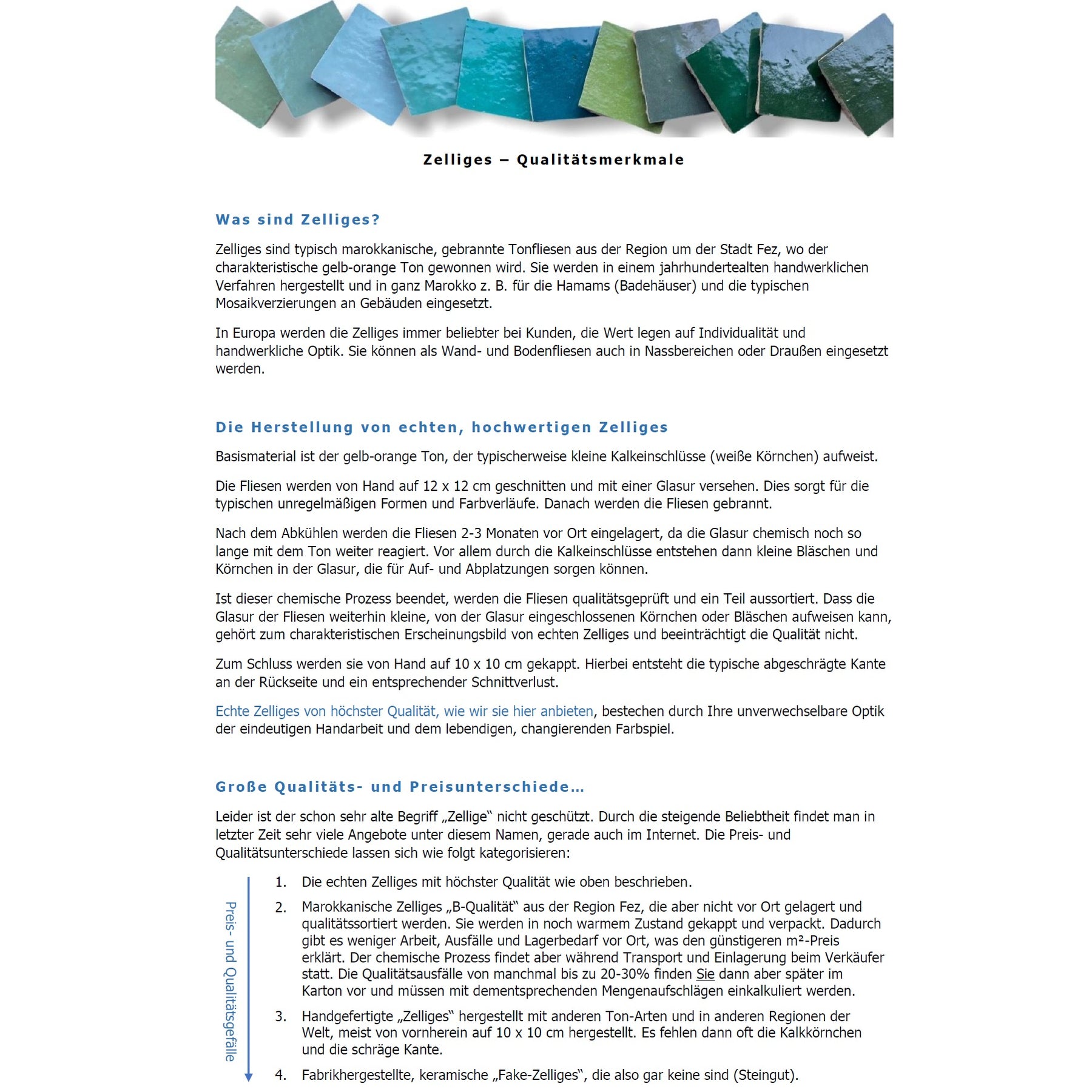 Echte Zelliges von höchster Qualität, wie wir sie hier anbieten, bestechen durch Ihre unverwechselbare Optik, die eindeutige Handarbeit und das lebendige, changierende Farbspiel.