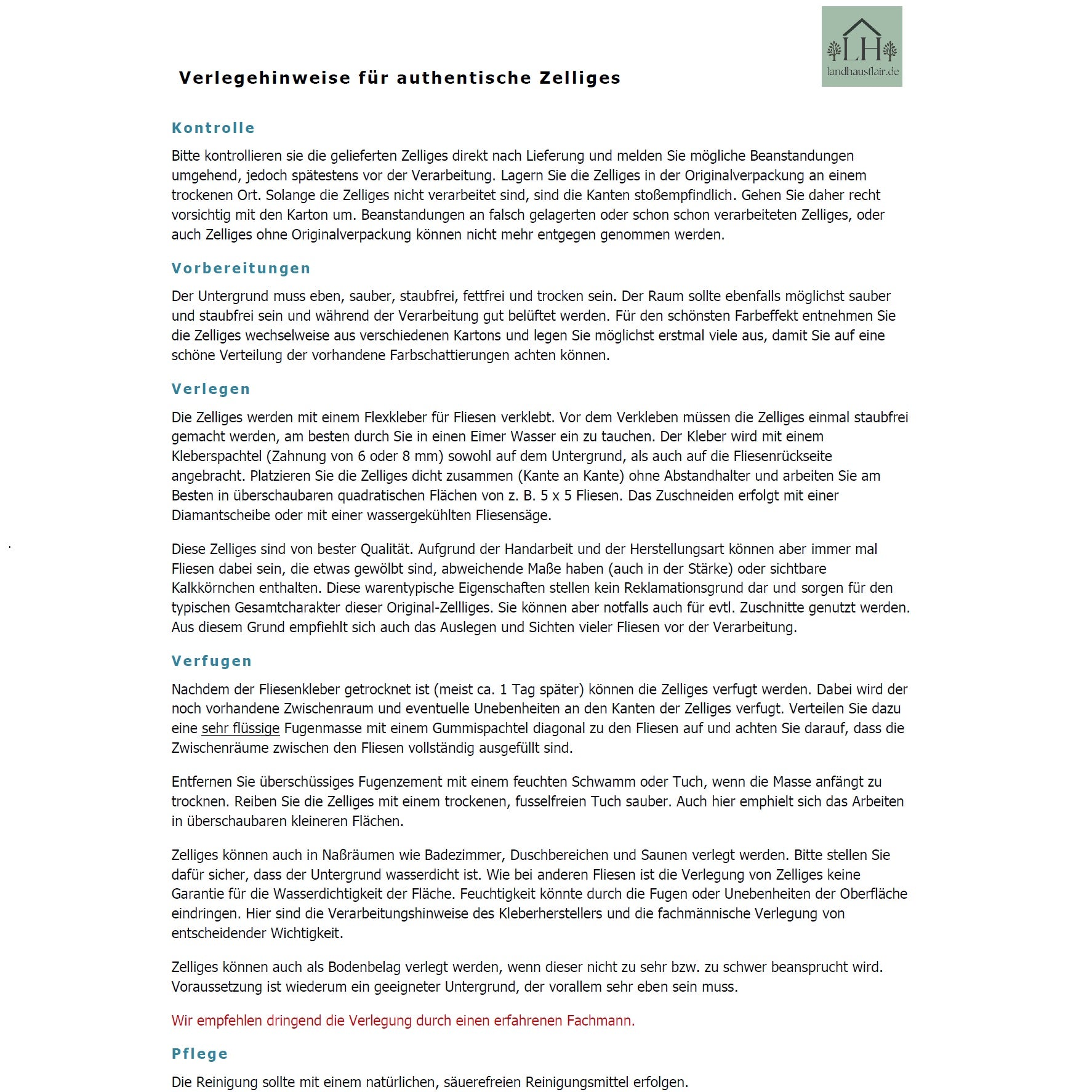 Wir empfehlen die Verlegung durch einen Fachmann!