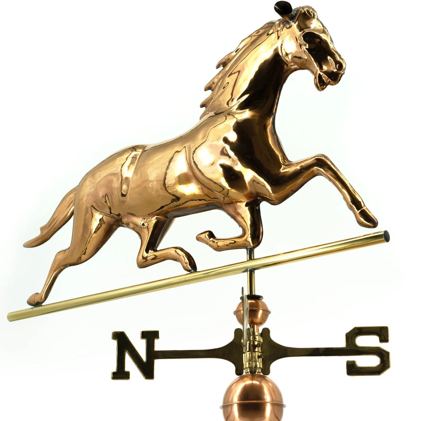 Stolz und selbstbewusst trabt dieses große Pferd aus Kupfer auf der Wetterfahne. Mit seinen Maßen von 80 x 45 cm ist er eine von weithin sichtbare und strahlende Landmarke.