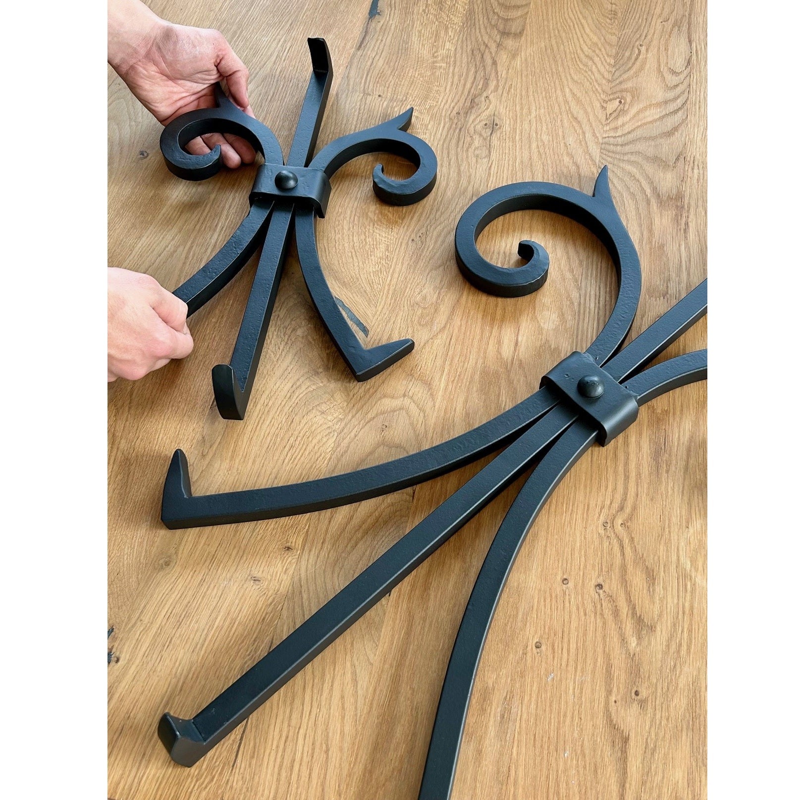 Massives Schmiedeeisen, 20 mm dick. Antirostbehandelt und pulverbeschichtet in schwarz RAL 9005. Wandbefestigung mit Montagekleber mittels beiliegenden Edelstahl-Gewindestangen.