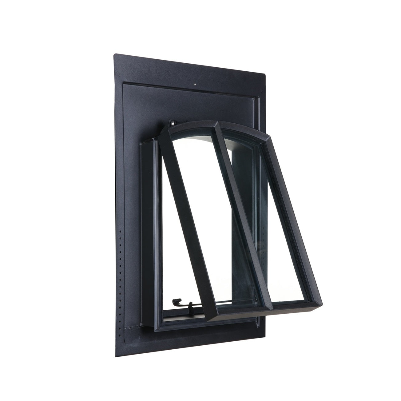 Dachfenster mit Stichbogen und senkrechter Sprosse. Das Fenster lässt sich öffnen und in mehreren Positionen mit einem Feststeller fixieren. Es ist verzinkt, gegen Rost behandelt und mit einer schwarzen Pulverbeschichtung versehen. Inklusive Montageplatte und fest montierter Ablaufrinne. Häufig verwendet bei Bauprojekten im Denkmalschutz. Geeignet für alle Dachtypen mit einer Mindestneigung von 29°.