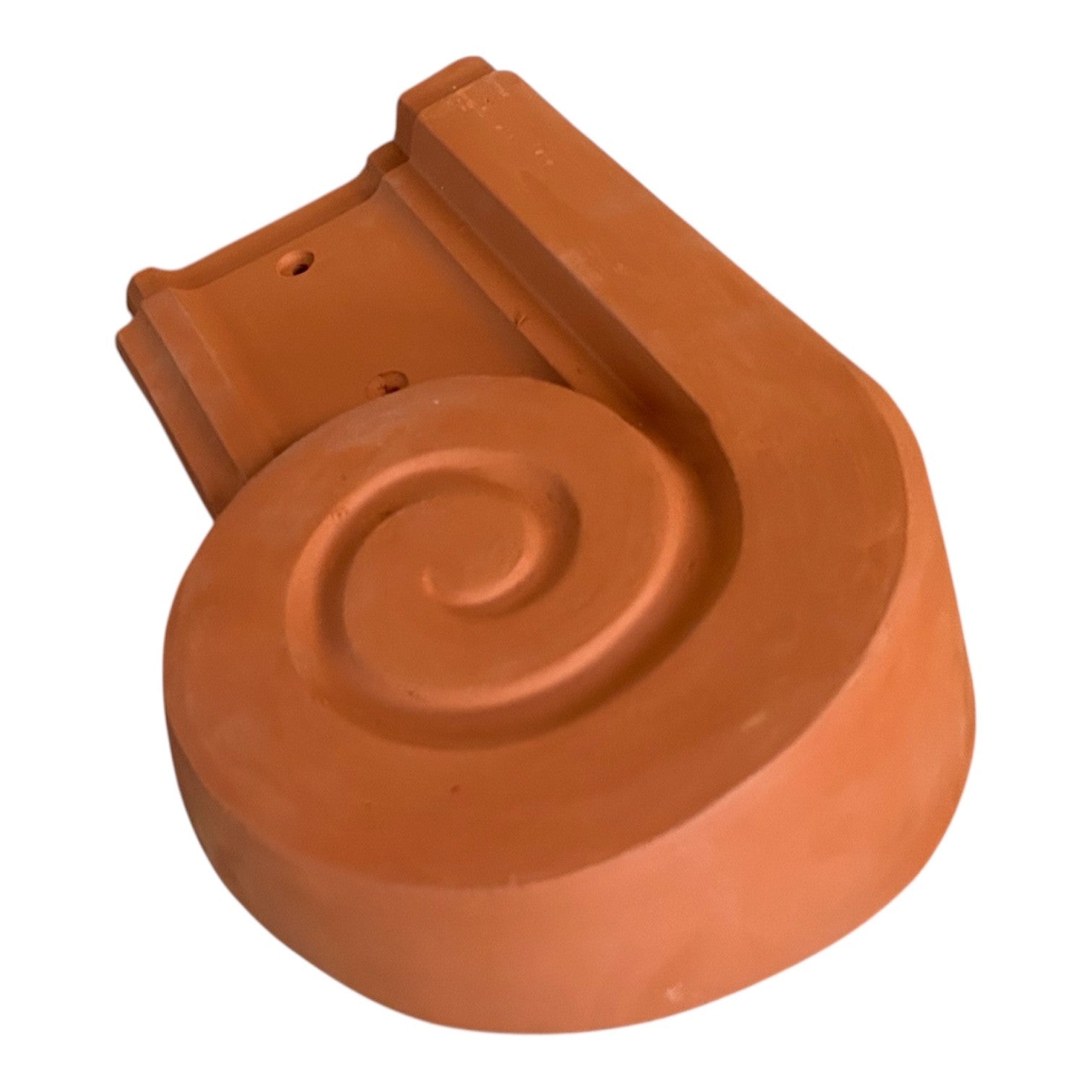 Formschöner Abschlussziegel in Schneckenform rechts bildet das stilvolle Gegenstück zur linken Variante und sorgt für einen ausgewogenen Dachabschluss. Aus Ton in Deutschland gefertigt, überzeugt sie durch Qualität und Wetterbeständigkeit.
