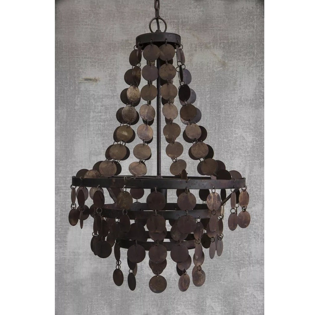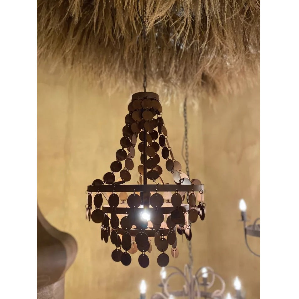 Der Kronleuchter "Balou" aus Eisen in rostbraun ist ein unvergleichliches Kunstwerk, das Eleganz und Charakter vereint. Sein kunstvoll arrangiertes Zusammenspiel aus feinen Scheiben und Ringen verleiht ihm eine außergewöhnliche Raffinesse. Die zarten Scheiben schenken Balou eine filigrane Leichtigkeit, während seine warme, rostige Farbgebung ihn zum strahlenden Mittelpunkt jedes Interieurs macht.