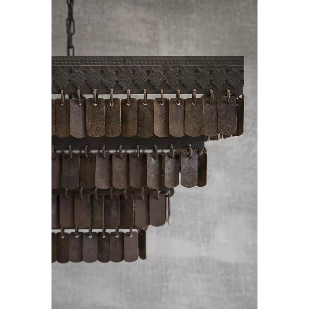Die "Gudha Square" Hängeleuchte überzeugt mit einem markanten Eisenrahmen und dekorativen Anhängern, die ihr ein charakteristisch strukturiertes Erscheinungsbild verleihen. Nach der Herstellung wird jede Lampe bewusst den Elementen ausgesetzt, wodurch ein attraktiver, leicht verwitterter Look entsteht. Dieses Naturfinish macht jedes Stück zu einem individuellen Unikat.