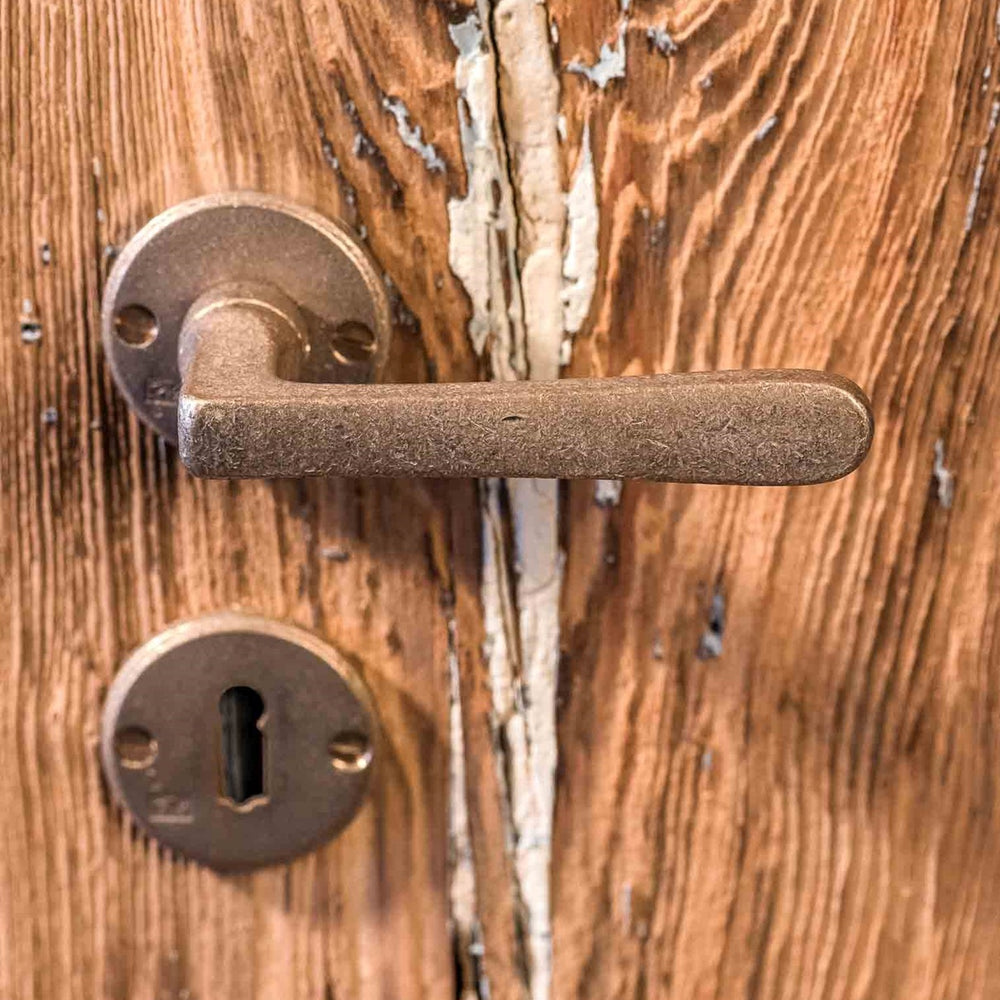 Unsere Türbeschläge bestehen aus massiven Messing- oder Bronze‑Legierungen mit feiner Patina-Oberfläche. Die robuste Verarbeitung sorgt dafür, dass sie auch nach Jahren intensive Nutzung stilvoll bleiben. Der Relief‑Schliff und die sanft geschwungenen Linien verleihen jeder Tür einen Hauch historischen Charmes.