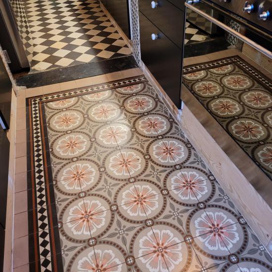 Original Zementfliese nach alter Handwerkstradition in Metallformen handgegossen und luftgetrocknet. Das Muster ist mehrere Millimeter durchgefärbt.