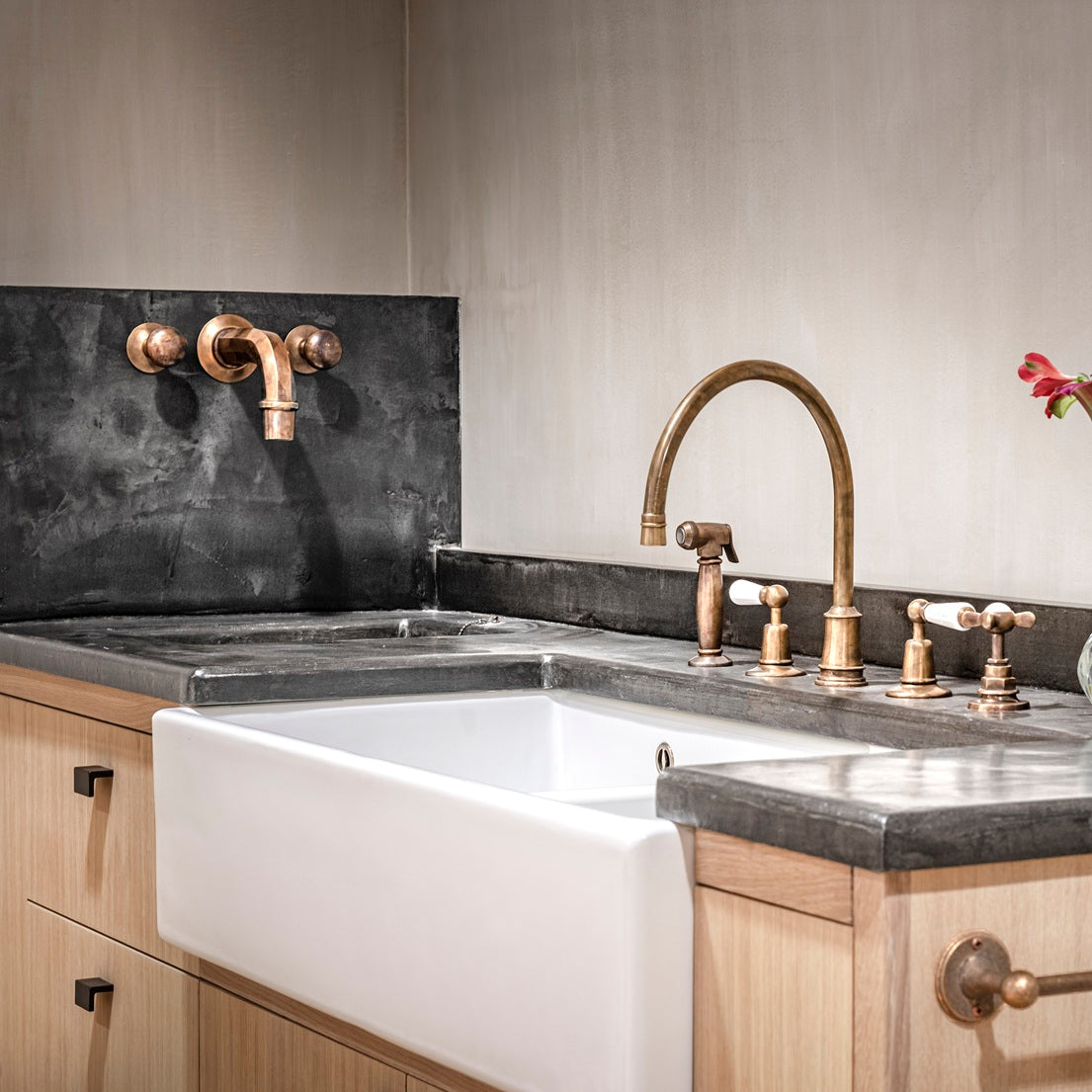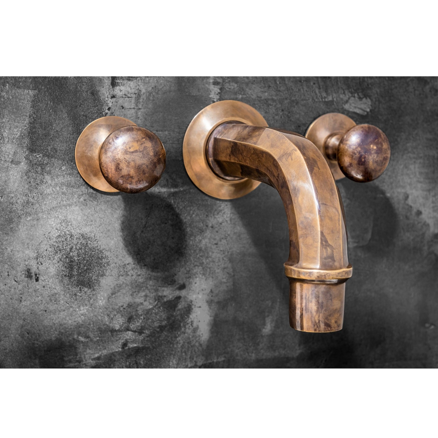 Der nostalgisch gestaltete Wasserauslauf dieser Wandarmatur aus Messing ist antiken Brunnenspeiern nachempfunden. Die beiden Wasserregler für kaltes und warmes Wasser sind als formschöne Knaufgriffe ebenfalls aus Messing gearbeitet. Die Armatur passt perfekt in eine Outdoorküche, rundet aber auch ein stilvoll gestaltetes Badezimmer mit authentischem Flair gelungen ab.