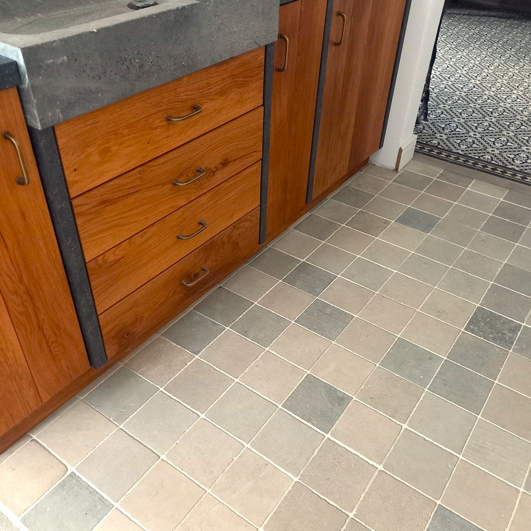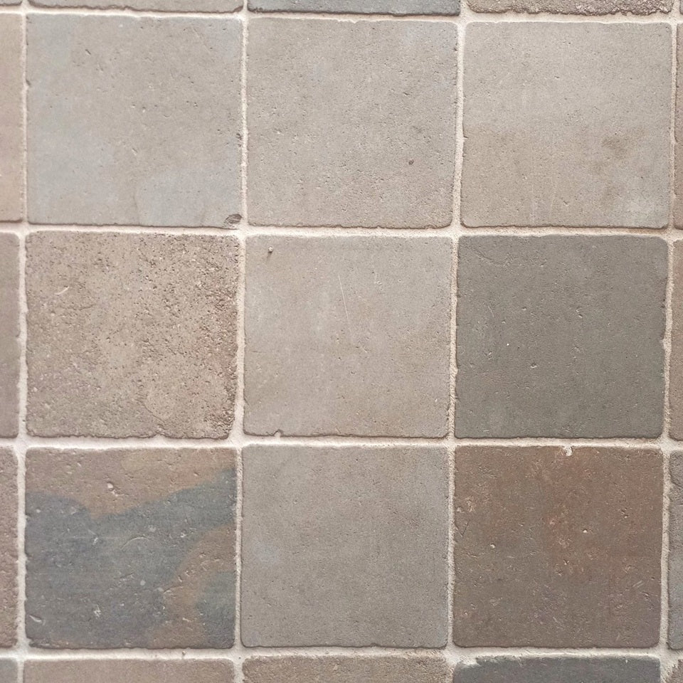 Die Farbnuancen dieses Natursteinbodens changieren von Grau und Graublau über Taupe und Beige bis hin zu Creme und erzeugen eine unverwechselbare, warme und gemütliche Atmosphäre. Dieser Natursteinboden wird aus verschiedenen Natursteinen hergestellt, anschließend werden die Fliesen weiterbearbeitet für eine veraltete Optik mit abwechslungsreichen Strukturen und Farbschattierungen.