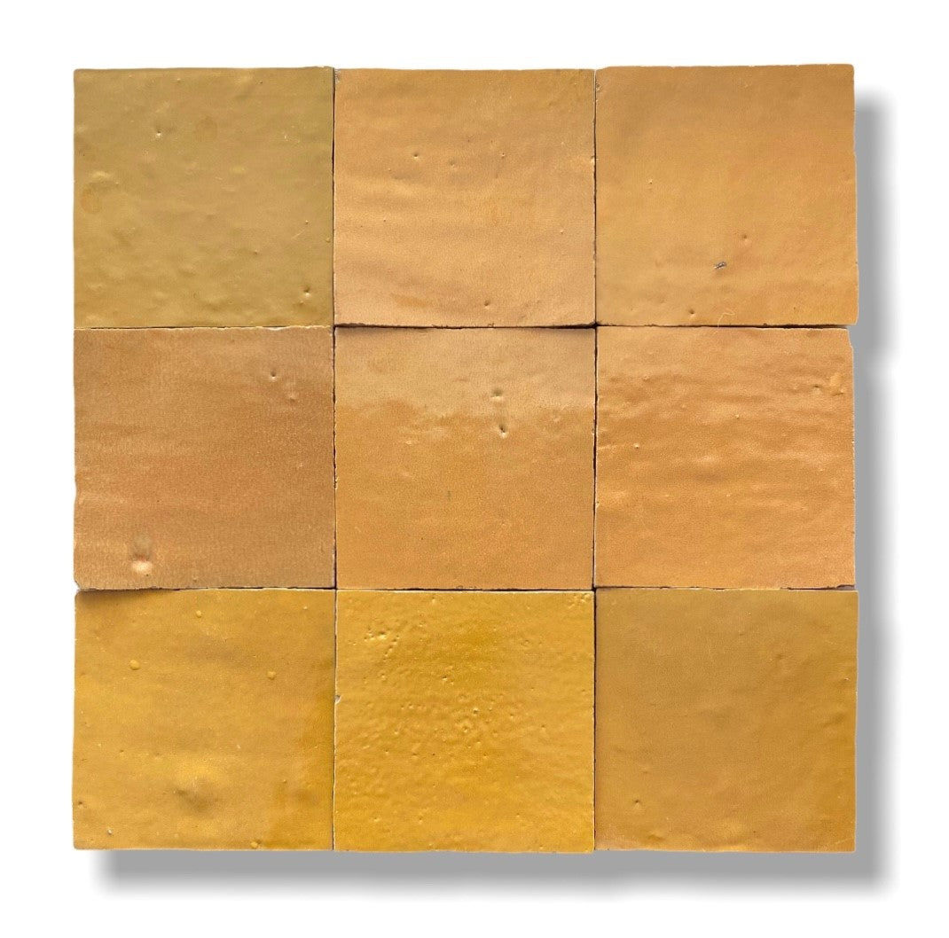 Basismaterial ist der gelb-orange Ton, der typischerweise kleine Kalkeinschlüsse (weiße Körnchen) aufweist. Die Tonfliesen werden von Hand zunächst größer als 10 x 10 cm zugeschnitten und mit einer Glasur versehen. Anschließend werden sie gebrannt. Diese Handarbeit, die Pigmentmixtur und der Platz im Brennofen sorgen für die typischen unregelmäßigen Oberflächen und Farbnuancen.
