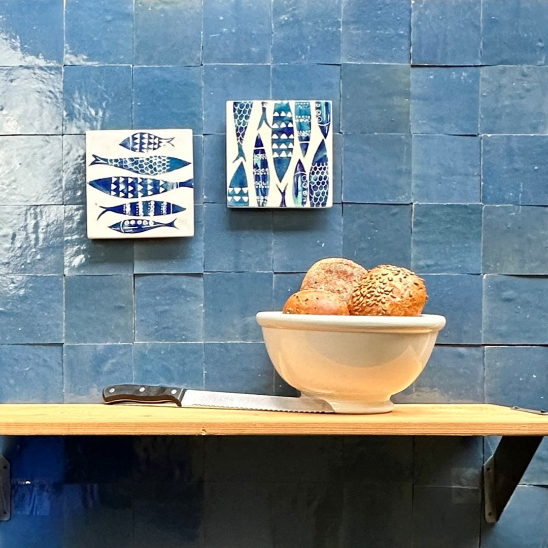 Ist dieser chemische Prozess beendet, werden die Fliesen qualitätsgeprüft und ein Teil aussortiert. Dass die Glasur der Fliesen weiterhin kleine, von der Glasur eingeschlossenen Körnchen oder Bläschen aufweisen kann, gehört zum charakteristischen Erscheinungsbild von echten Zelliges und beeinträchtigt die Qualität nicht. Zum Schluss werden sie von Hand auf 10 x 10 cm geschnitten und gekappt. Hierbei entsteht die typische abgeschrägte Kante an der Rückseite.