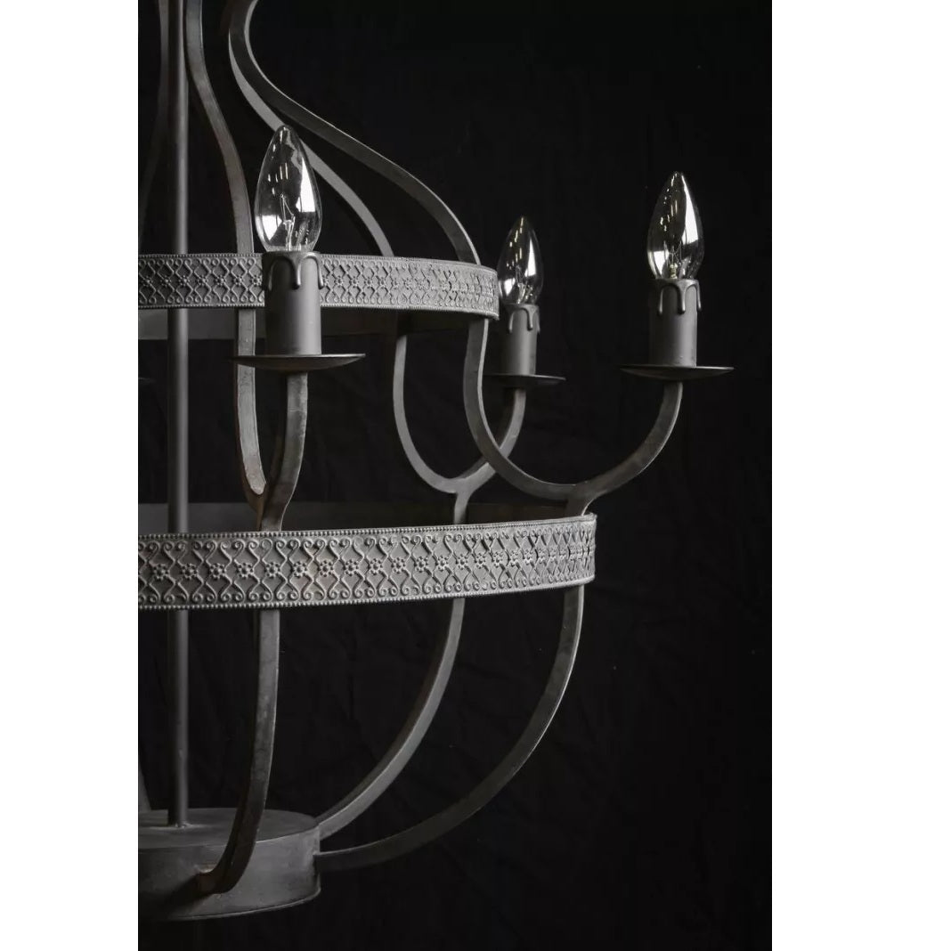 Dieser Kronleuchter aus massivem Eisen besticht durch seine eleganten, geschwungenen Formen und die filigranen Verzierungen an den Ringen. Dank der schmalen Eisenstreben wirkt er leicht und luftig. Die stabile Ausführung eröffnet viele Möglichkeiten zur Dekoration – ergänzt mit einem Weihnachtskranz oder Osterschmuck verwandelt er sich in ein jahreszeitliches Highlight über Ihrem Tisch!