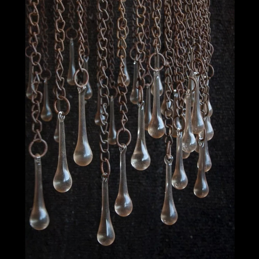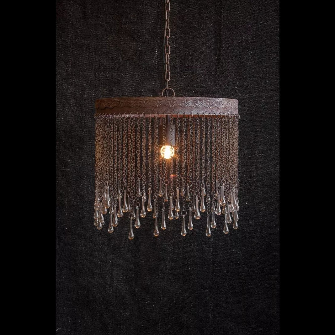 Die Hängeleuchte "Shanti" vereint eine robuste Aufhängung in Rostoptik aus gealtertem Eisen mit filigranen Eisenkettchen und eleganten, braun-veredelten Glastropfen. Der Eisenring ist mit einer feinen, fast spitzenartigen Bordüre verziert. Im Licht reflektieren die Glaströpfchen dezent und erzeugen eine stimmungsvolle Atmosphäre. Mit ihrer Schönheit und ihrer zugleich eleganten wie robusten Ausstrahlung ist diese Hängeleuchte eine markante und stilvolle Bereicherung für jedes Interieur.